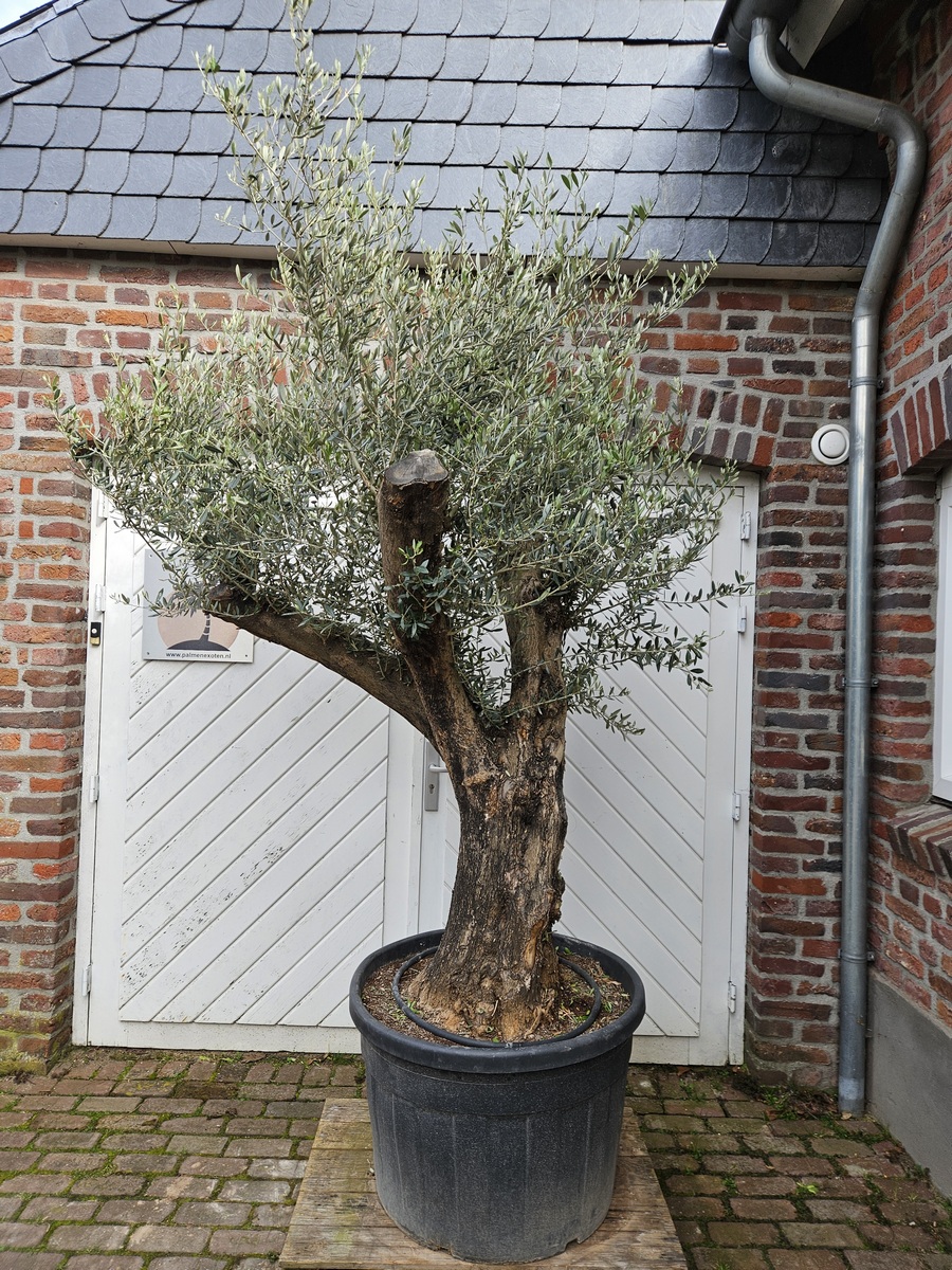 De boom wordt geleverd in een ruime 90 liter pot met een potdiameter van 65 cm. De stamomtrek ligt tussen de 80 en 100 cm en de totale hoogte inclusief pot bedraagt circa 235 cm. Daarmee is dit een forse olijfboom die direct opvalt en perfect tot zijn recht komt als solitaire blikvanger op een zonnige plek.