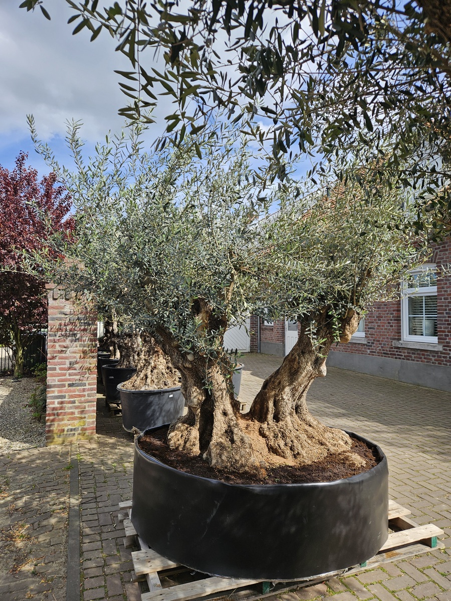 De Olea Europaea Bonsay Dobble is een indrukwekkende olijfboom met een exclusieve, karaktervolle uitstraling en een volwassen mediterrane sfeer. Deze boom wordt geleverd met een kluitdiameter van circa 150 cm, heeft stamomtrekken van 100 tot 120 cm en een totale hoogte inclusief kluit van ongeveer 275 cm. Een echte blikvanger voor tuin, terras of entree.