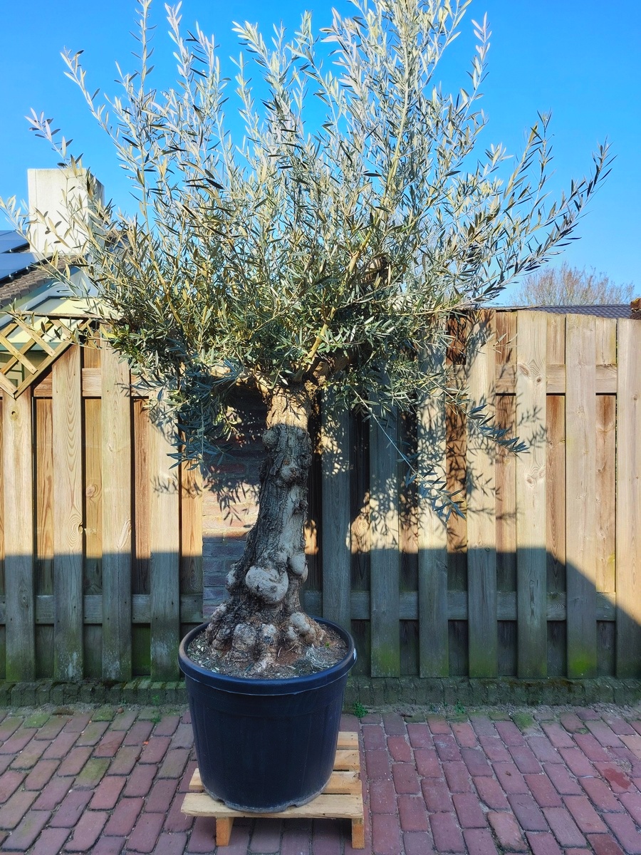 De boom wordt geleverd in een ruime 110 liter pot met een potdiameter van 60 cm. De stamomtrek bedraagt circa 60 tot 80 cm en de totale hoogte inclusief pot is ongeveer 225 cm. Daarmee is dit een forse olijfboom die direct opvalt en perfect tot zijn recht komt als solitaire boom in een zonnige buitenruimte.