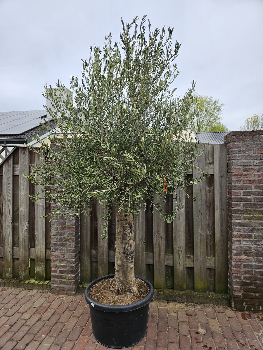 De olijfboom wordt geleverd in een ruime 100 liter pot en heeft een potdiameter van 65 cm. Met een stamomtrek van circa 80 cm en een totale hoogte inclusief pot van ongeveer 225 cm is dit een forse en decoratieve boom die direct opvalt.