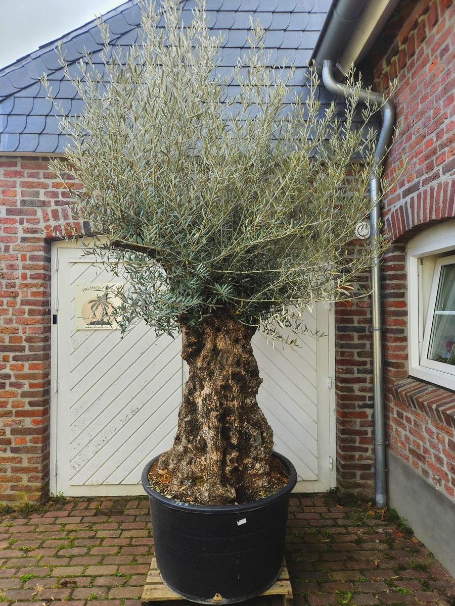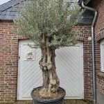 De boom wordt geleverd in een ruime 230 liter pot met een potdiameter van 80 cm. De stamomtrek bedraagt circa 100 tot 120 cm en de totale hoogte inclusief pot is ongeveer 260 cm. Daarmee is dit een forse olijfboom die direct opvalt en perfect tot zijn recht komt als solitaire blikvanger in een zonnige buitenruimte.