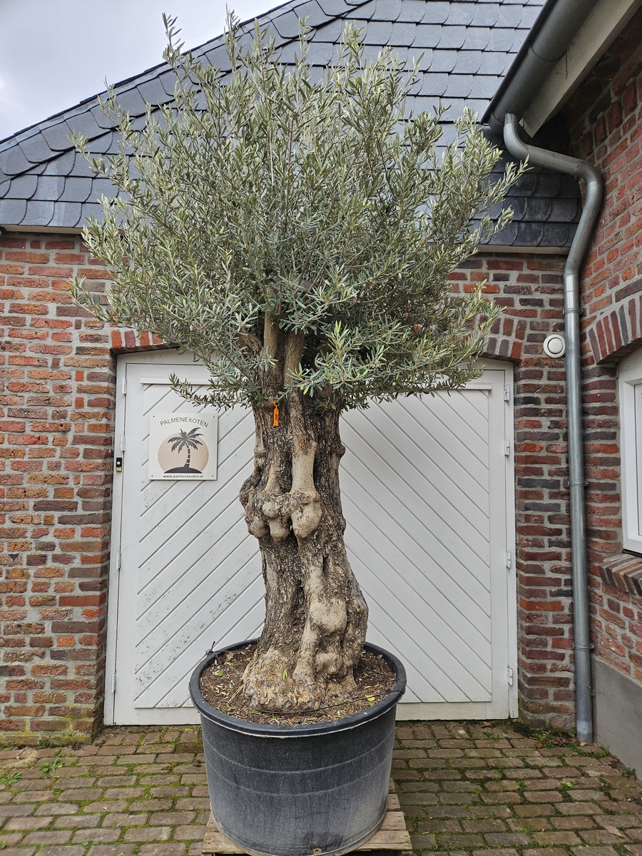 De boom wordt geleverd in een ruime 230 liter pot met een potdiameter van 80 cm. De stamomtrek bedraagt circa 80 tot 100 cm en de totale hoogte inclusief pot is ongeveer 260 cm. Daarmee is dit een forse olijfboom die direct opvalt en perfect tot zijn recht komt als solitaire boom in een zonnige buitenruimte.