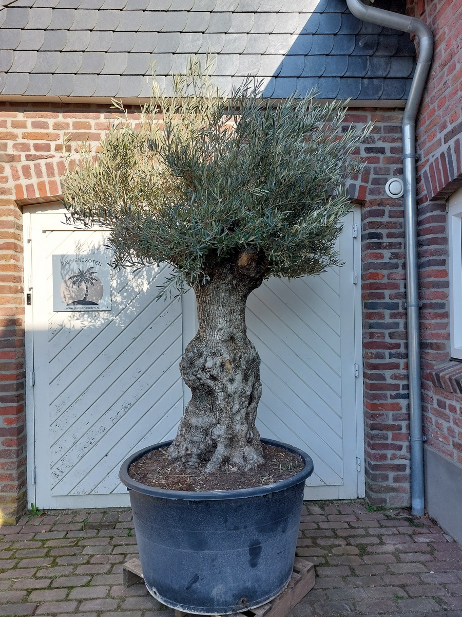 De boom wordt geleverd in een ruime 230 liter pot met een potdiameter van 80 cm. De stamomtrek bedraagt circa 80 tot 100 cm en de totale hoogte inclusief pot is ongeveer 240 cm. Daarmee is dit een forse olijfboom die direct opvalt en perfect tot zijn recht komt als solitaire boom in een zonnige buitenruimte.