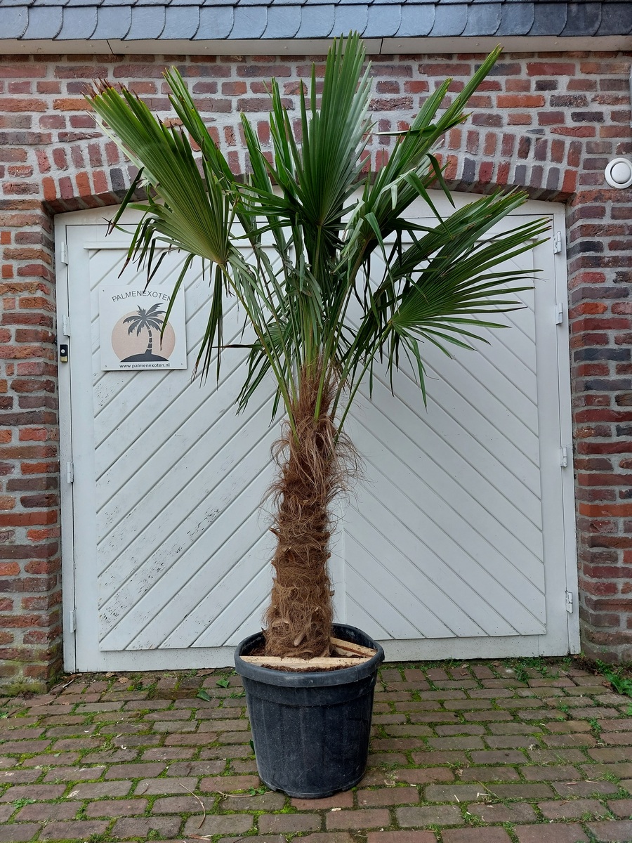 De palm wordt geleverd in een ruime 70 liter pot met een potdiameter van 55 cm. De stamhoogte bedraagt circa 70 tot 80 cm en de totale hoogte is ongeveer 140 cm. Daardoor heeft deze palm al een mooie, zichtbare stam en een vollere uitstraling, wat meteen extra sfeer en hoogte geeft aan de plek waar je hem neerzet.